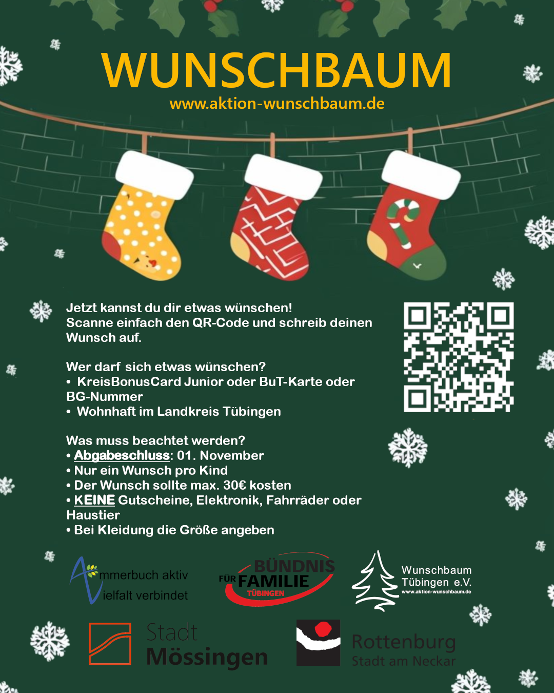 Die 8. Wunschbaum-Aktion Ammerbuch geht 2025 in eine neue Runde und schließt sich diesmal der landkreisweiten digitalen Wunschbaum-Aktion an. Diese Initiative, koordiniert von der kit Jugendhilfe im Rahmen des Projekts "Ammerbuch Aktiv - Vielfalt verbindet", richtet sich an Kinder im Alter von 0 bis 12 Jahren.