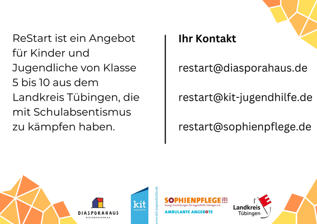 ReStart ist ein Angebot für Kinder und Jugendliche im Landkreis Tübingen zur Begleitung und Beratung junger Menschen, denen es schwer fällt, zur Schule zu gehen.