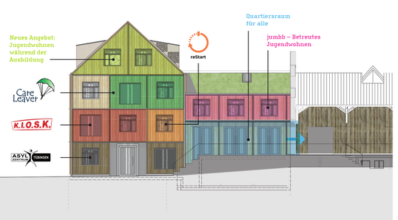 Mit den Angeboten und Hilfen unter einem Dach bieten wir den jungen Menschen niederschwelligen Zugang zu ihnen zustehenden Unterstützungsleistungen. Die verschiedenen Angebote in einem Gebäude schaffen große und neue Synergien.