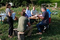 Bei einem sommerlichen Abend im Hofgarten waren Vertreter*innen der Bürgerstiftung und der Fraktionen des Tübinger Gemeinderats bei Apfelcidre und kleinen Gemüsesnacks vom Berghof im Gespräch.